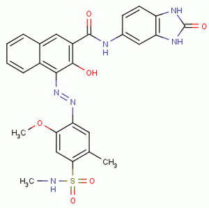 Aliasuri:2-Naphthalenecarboxamide, N-(2,3-dihydro-2-oxo-1H-benzimidazol-5-yl)-3-hydroxy-4-((2-methoxy-5-methyl-4-((methylamino)sulfonyl)phenyl)azo)-; 2-Naphthalenecarboxamide, N-(2,3-dihydro-2-oxo-1H-benzimidazol-5-yl)-3-hydroxy-4-(2-(2-methoxy-5-methyl-4-((methylamino)sulfonyl)phenyl)diazenyl)-; N-(2,3-Dihydro-2-oxo-1H-benzimidazol-5-yl)-3-hydroxy-4-((2-methoxy-5-methyl-4-((methylamino)sulphonyl)phenyl)azo)naphthalene-2-carboxamide; 12516; Deep Scarlet; Permanent Carmine HF4C; Peony Red [HO]; ; (4Z)-4-{2-[2-methoxy-5-methyl-4-(methylsulfamoyl)phenyl]hydrazinylidene}-3-oxo-N-(2-oxo-2,3-dihydro-1H-benzimidazol-5-yl)-3,4-dihydronaphthalene-2-carboxamide